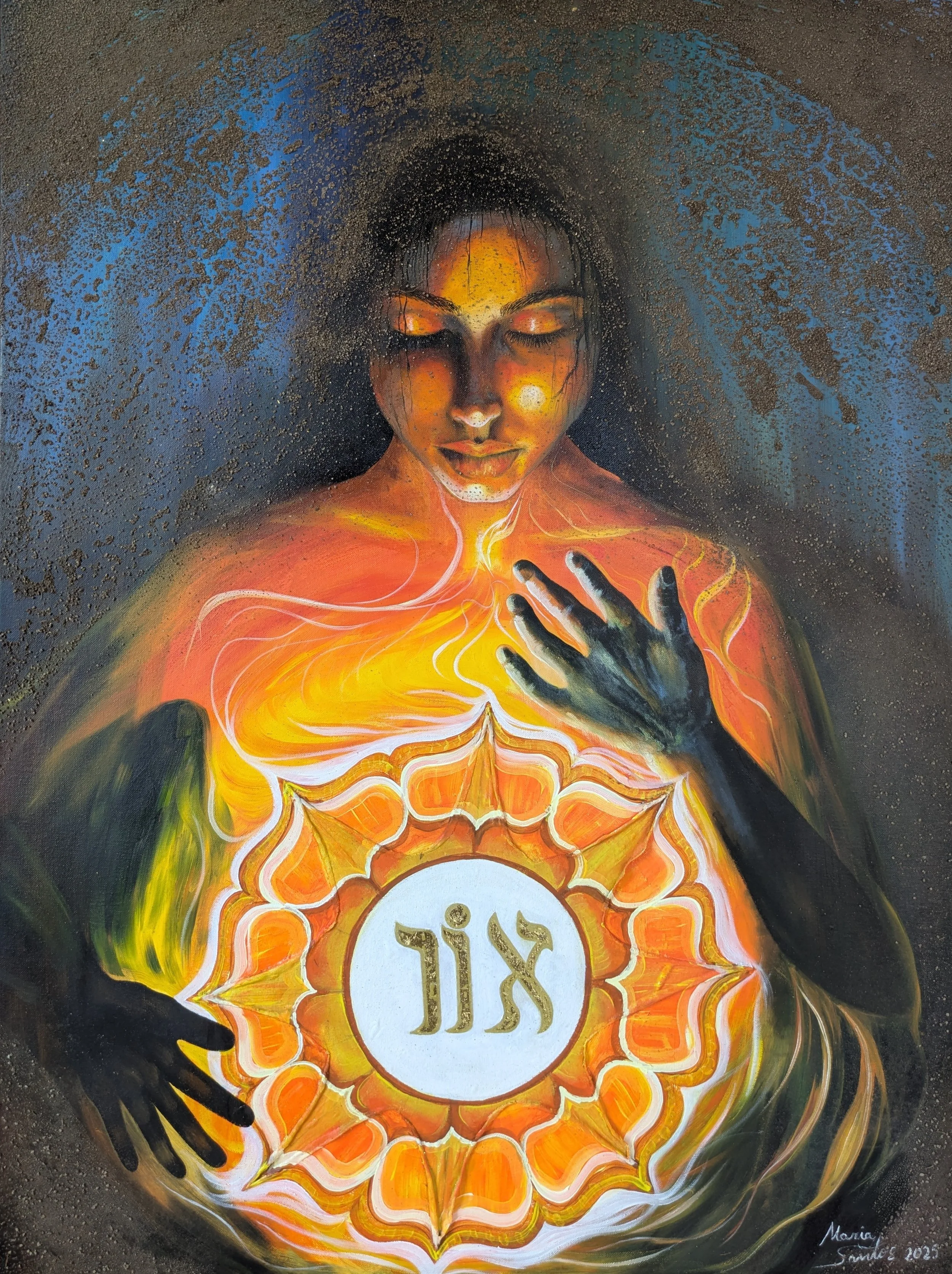 Cette œuvre qui symbolise l’illumination intérieure et la transformation spirituelle. La figure centrale, baignée de lumière, canalise une énergie vibrante qui émane du chakra solaire, où apparaît le mot hébreu "אור" (Or), signifiant "lumière". Le contraste entre les ombres et la lueur dorée souligne la quête de clarté et de connexion avec l’essence divine. Cette peinture invite à l’introspection et à l’éveil spirituel.