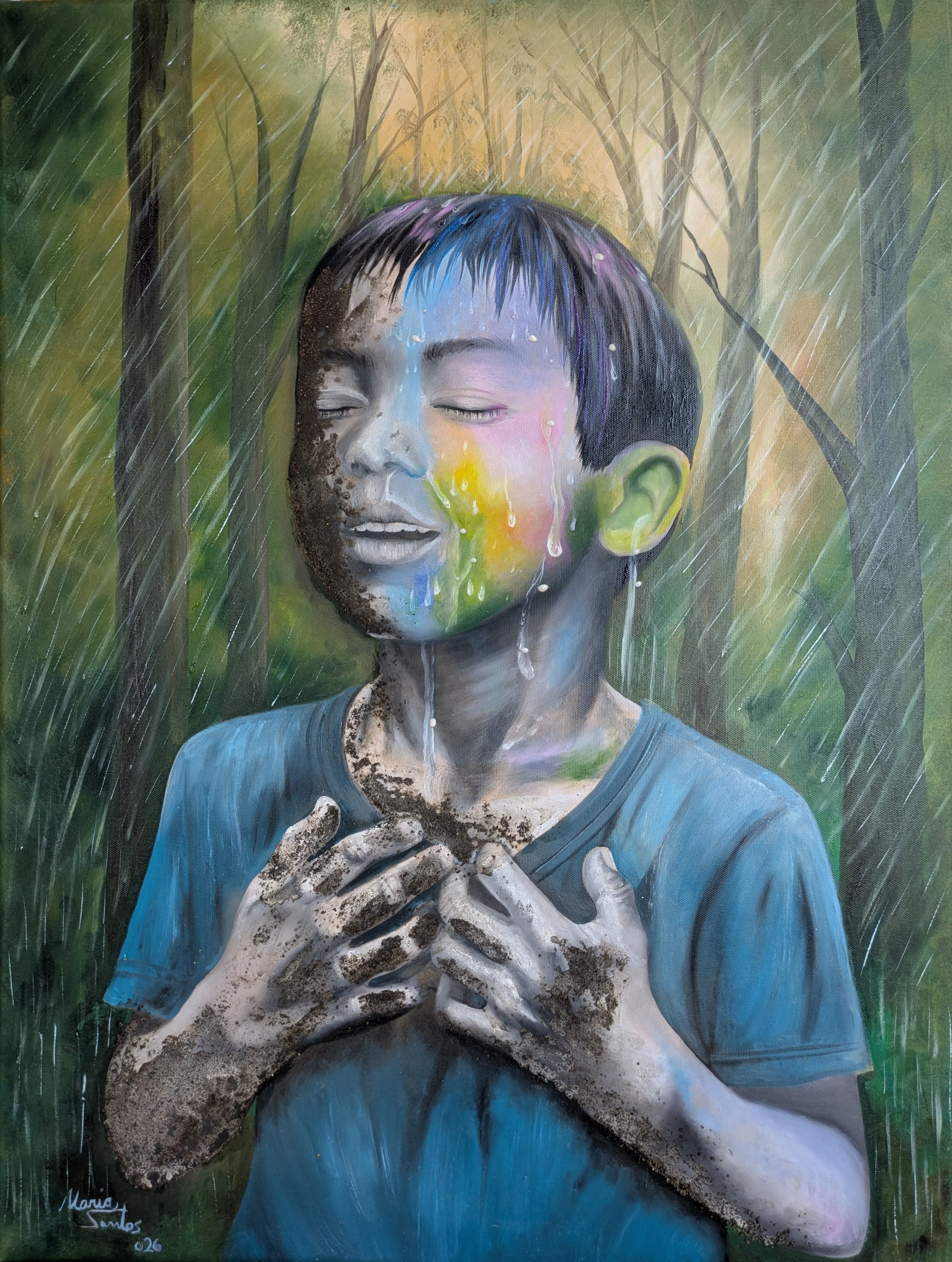 Dans cette œuvre, la pluie agit comme un processus de guérison et de résistance. Elle vient éroder la « croûte » monochrome et rigide imposée par les structures systémiques pour laisser émerger la véritable essence chromatique de l'être. Ce passage du noir et blanc à la couleur n'est pas une simple transition esthétique, mais un acte politique de reconnexion avec la nature et avec la propre identité viscérale. Le dévoilement suggère que la vie et la couleur ne sont pas ajoutées, mais redécouvertes sous le poids des conventions.